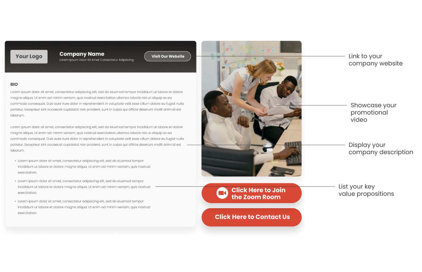 A Booth Profile is the heart of your Booth. It's where attendees come to learn more about your company and start a conversation with your staff.